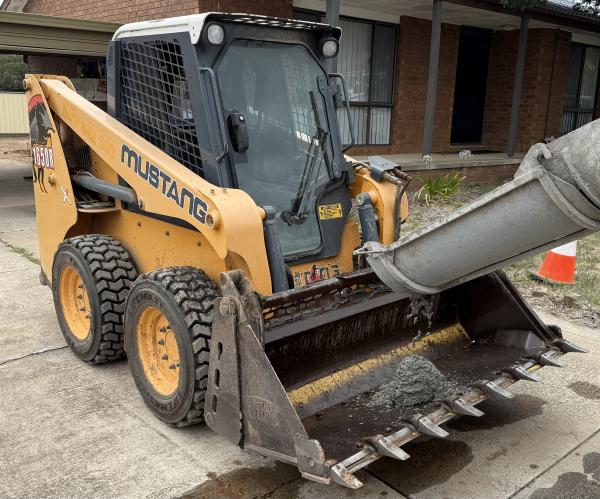 Running concrete out into the back yard with Sally the Mustang skid steer.